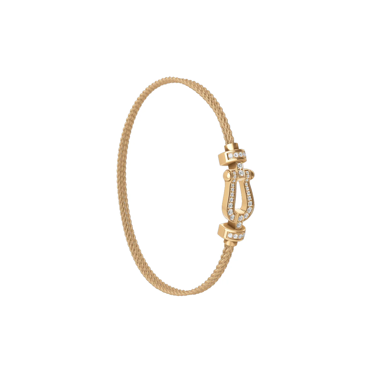 One of the Maison's signature pieces, the Force 10 bracelet was created in 1966 and reflects contemporary fashion as much as and the maritime and sporting influences behind its inception. This surprise encounter of a woven steel sailing cable with a gold or steel buckle goes beyond jewellery, having come to symbolise a sense of freedom, achievement, courage and casual elegance. 18k yellow gold medium model buckle. 34 brilliant cut white diamonds: 0,25 carat. Buckle length: 20 mm. Buckle width: 9 mm. 18k yellow gold multi-link cable medium model bracelet. Styles: OB0071 and 6B1010.